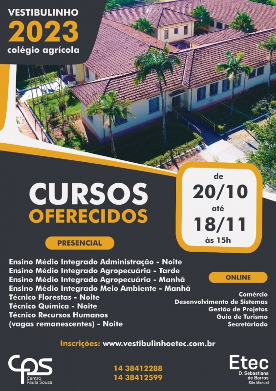 Estão abertas as inscrições do vestibulinho ETEC (Colégio Agrícola) do dia 20/10 às 15h00 do dia 18/11.