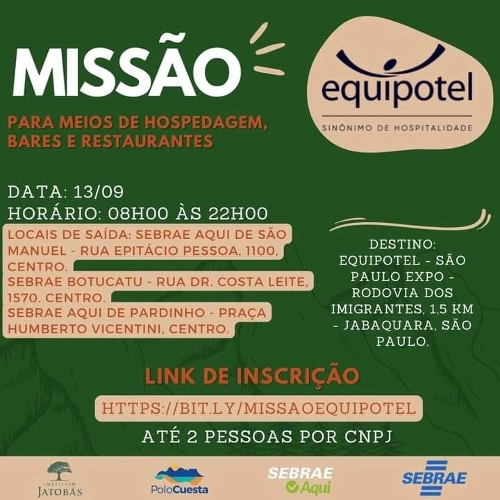 A regional do Sebrae-SP está com inscrições para que empresários da região do Polo Cuesta possam participar gratuitamente do Equipotel 2022, que acontecerá no próximo dia 13 de setembro, no São Paulo Expo.