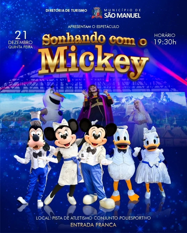 Para este ano, a Diretoria de Turismo reservou uma atração especial para a criançada: o espetáculo "Sonhando com o Mickey", que será realizado no dia 21 de dezembro (quinta-feira), a partir das 19h30, na pista de atletismo do Conjunto Poliesportivo, com entrada franca.